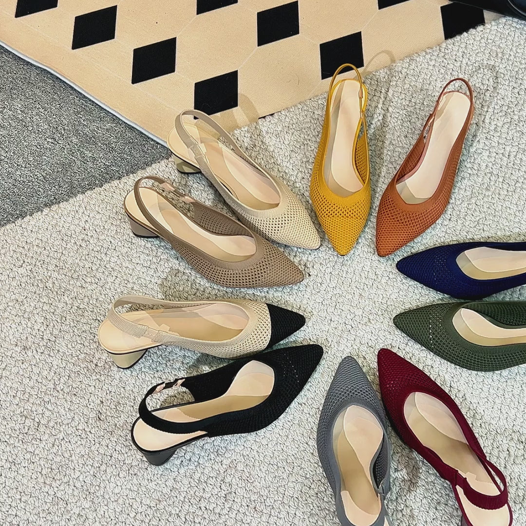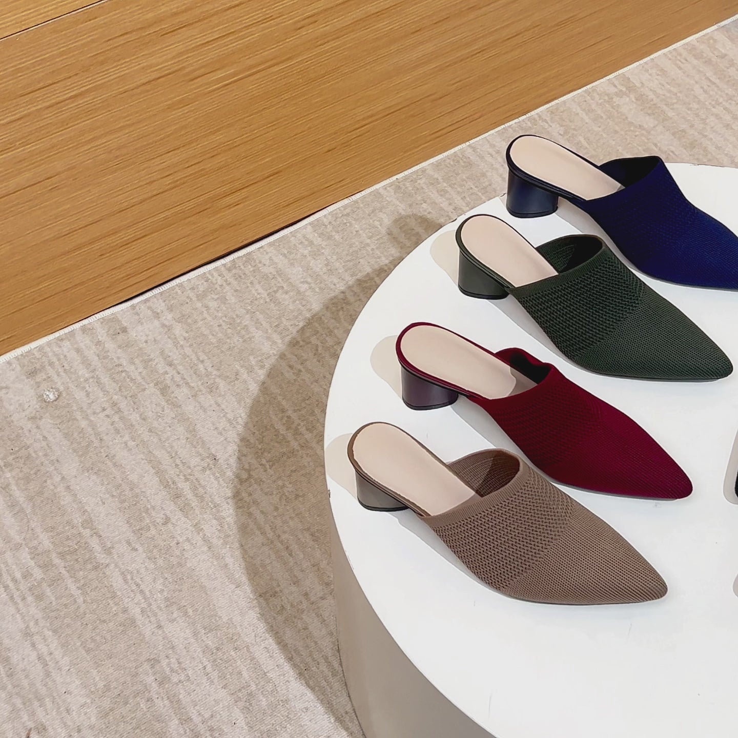 レディース 深口ポインテッドトゥ ミュールサンダル チャンキーヒール