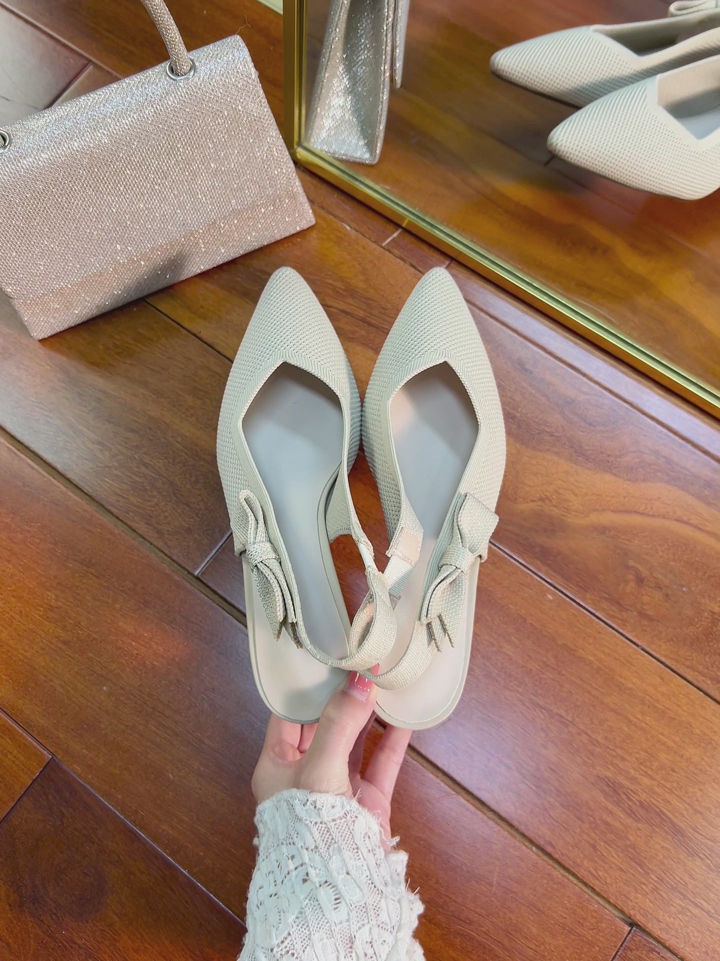 上品な尖頭デザインの後ろリボン付き太ヒールサンダル