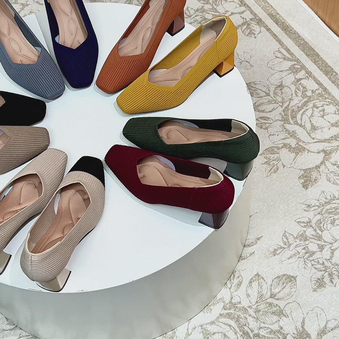スクエアトゥVカット粗ヒールパンプス(6cmハイヒール)